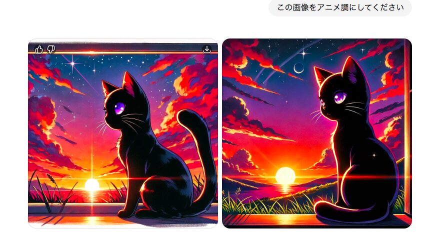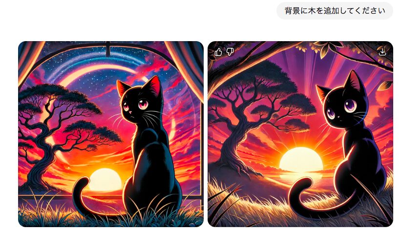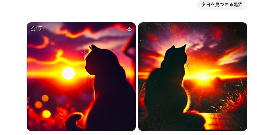 たとえば「夕日を見つめる黒猫」や「未来都市を歩くロボット」と入力すると、AIが指示を理解し、数秒で複数の高品質な画像を作り出します。