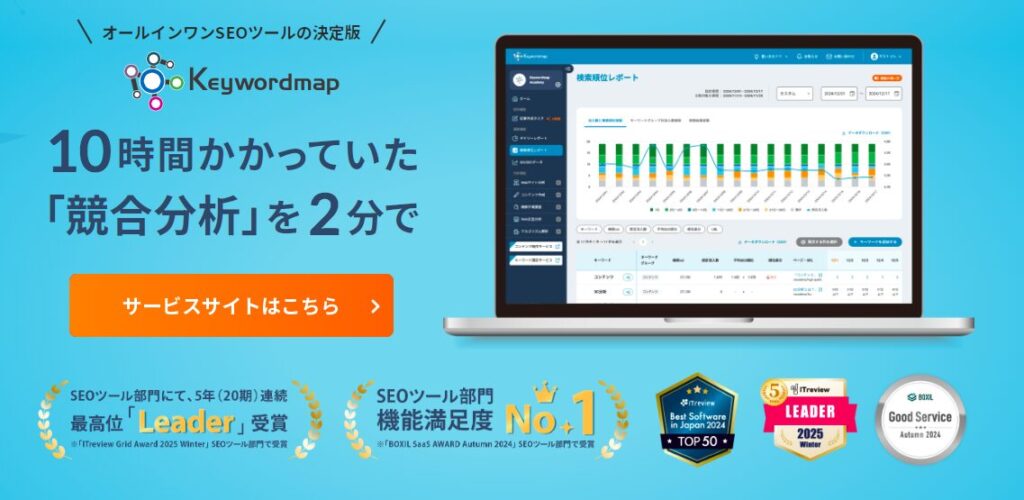Keywordmapは、膨大な検索データをもとにユーザーの検索意図を可視化できる国産SEOリサーチツールです。