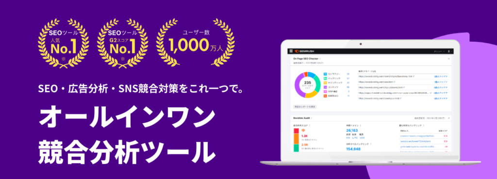 SEMrushは、世界中で利用されているオールインワン型SEOツールで、リサーチ機能の充実度が際立っています。